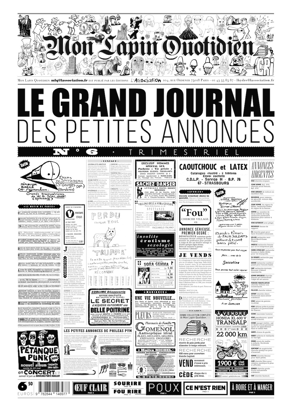 Mon Lapin Quotidien se lance dans les affaires ! Les affaires à ne pas rater, les aubaines à saisir. Ce numéro printemps-été, c’est des centaines d’affaires bien juteuses comme des fruits gorgés de soleil ! Des wagons de petites annonces à foison. Des choses que l’on cherche, dont on cherche à se débarrasser, des choses à vendre, à donner, à échanger, des gens qui se vendent, qui se donnent qui s’échangent, toutes sortes de choses, les choses de l’esprit y compris, toutes sortes de gens, d’esprit exclusivement. C’est une manière de «MLQ BOUM BOUM» qui va faire un bruit du tonnerre. Et les affaires de nos lecteurs ! Sans oublier, évidemment, les plus belles plumes de la littérature, de la bande dessinée et du dessin contemporain ! Ce qui, on en conviendra aisément, ne gâche rien, au contraire. MLQ, ou comment faire des affaires tout en se rinçant la rétine et en se musclant les méninges. MLQ est copain avec radio NOVA.