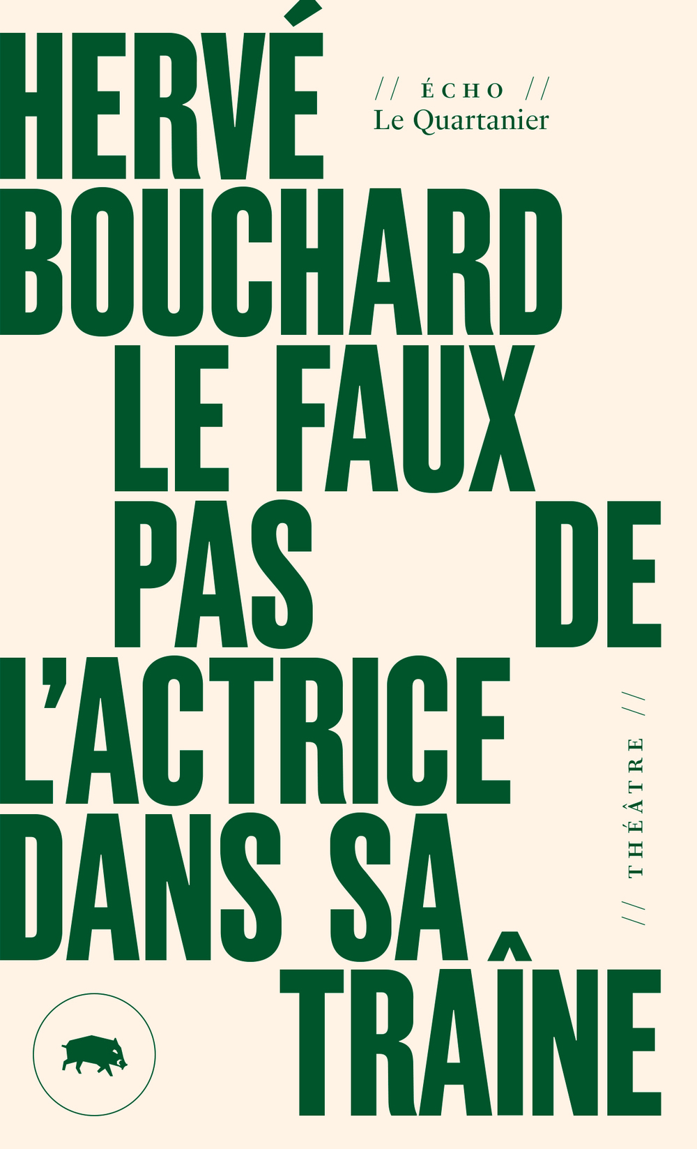 Le faux pas de l’actrice dans sa traîne, c’est un drame en trois scènes avec deux chants en guise d’indications. Ça se passe au théâtre. Le personnage de la veuve, prisonnière de la fameuse robe en bois au centre de Parents et amis sont invités à y assister, devient ici le rôle qu’on donne à une actrice, comme un piège qu’on tend à une personne qu’on souhaite humilier. Comme il se doit, le piège ne se referme pas. Il donne plutôt à la parole son volume. Et on l’entend, cette parole, déborder du théâtre et se mêler à la vie.