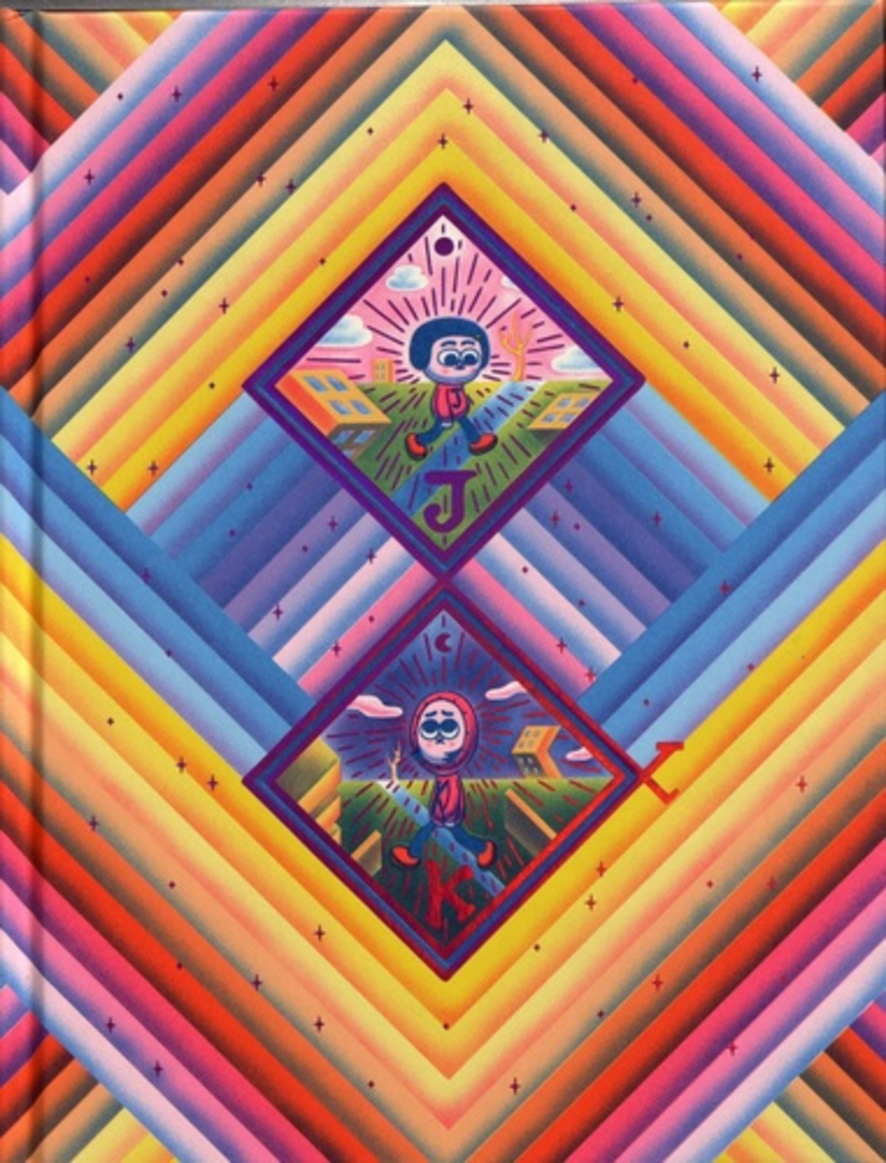 Dans J+K se dévoile un univers sans réel équivalent, faisant parfois écho aux Peanuts de Schulz mais avec une atmosphère bien plus viciée, un mélange de charme rétro et d’expérimentation actuelle, et une bonne dose de folie et de mordant. Ils évoluent dans un monde pop et imprévisible, où un méchant bouton dans le cou donne naissance à une créature indescriptible, et où des vampires dépressifs squattent les centres commerciaux. Les rêves sont peu flamboyants, les déceptions souvent cruelles mais l’humour, salvateur, bien présent, et la critique sociale jamais bien loin. Portrait d’une certaine Amérique, celle des malls géants et du consumérisme à tout crin, J+K joue jusqu’à l’extrême la cohérence du fond et de la forme, et se présente comme un objet complètement hors norme. Le petit monde de J+K est ainsi prolongé dans la fabrication même du livre, et plus spécialement dans ses nombreux suppléments (vinyl, petite revue, mini-poster, stickers), suppléments qui font écho aux pérégrinations de Jay et Kay et offrent ainsi une expérience totale et jubilatoire.