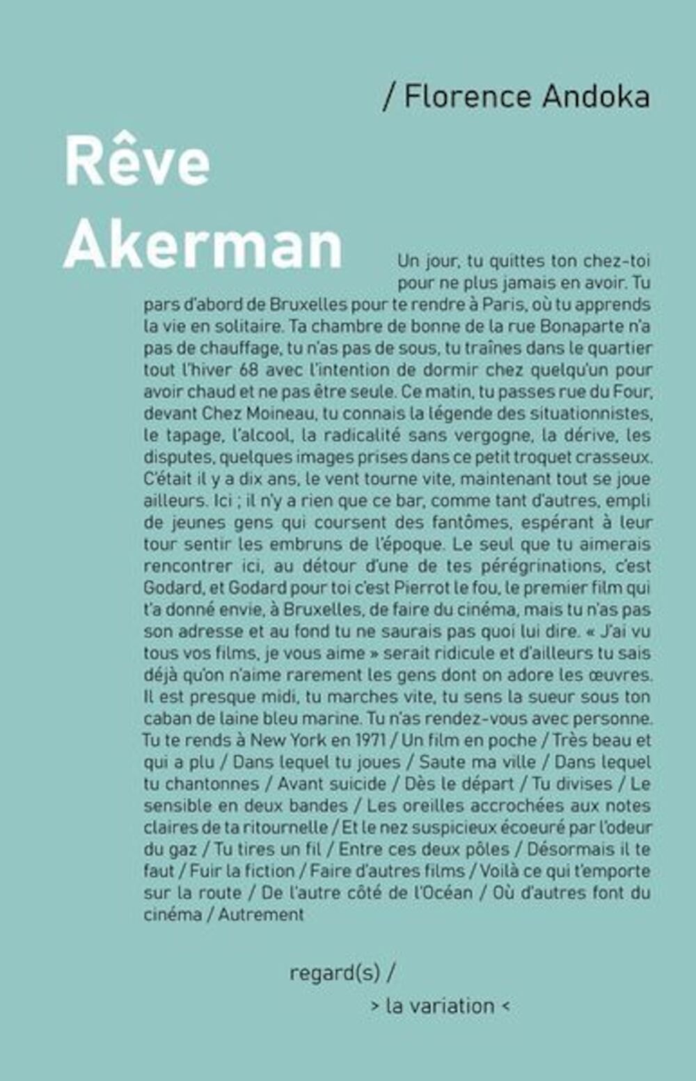 Rêve Akerman est une réaction, celle d'un regard qui imagine une vie à travers une oeuvre, y éprouve sa sensibilité et recompose une époque.