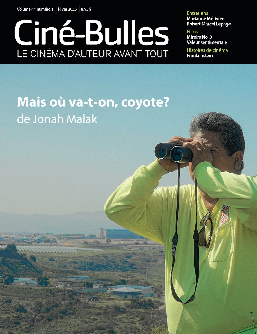 Ce numéro propose trois entretiens : le réalisateur Jonah Malak pour Mais où va-t-on, Coyote? (film en couverture du numéro), la réalisatrice Marianne Métivier pour Ailleurs la nuit et le compositeur Robert Marcel Lepage, qui accorde une longue entrevue sur sa carrière. Aussi au sommaire : le cinéma de genre québécois contemporain en perspective, Frankenstein de James Whale (1931) pour la section Histoires de cinéma et un hommage à l’acteur Tchéky Karyo (1953-2025). Des avant-plans sont consacrés aux œuvres Miroirs No. 3 de Christian Petzold et Valeur sentimentale de Joachim Trier, la section Critiques comporte 15 textes sur autant de films.