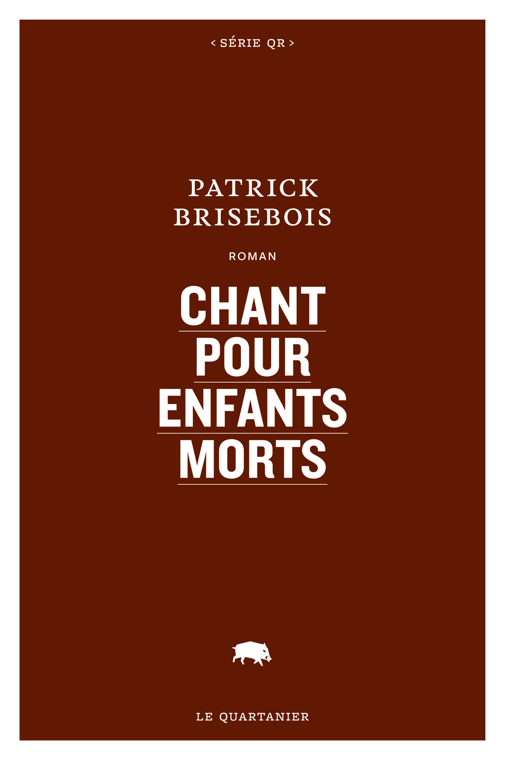 Né à Verdun en 1971, Patrick Brisebois est l’auteur de quatre romans et d’un recueil de poèmes. Son plus récent roman, Catéchèse, est paru en 2007 chez Alto. À l’Effet pourpre, il a fait paraître trois romans : Que jeunesse trépasse (1999), Trépanés (2000) et Chant pour enfants morts (2003). Il vit à Louiseville, en Mauricie. Le Quartanier a amorcé la republication des trois romans de l’Effet pourpre, dans des versions revues par l’auteur : Trépanés et Chant pour enfants morts sont parus en 2011, et Que jeunesse trépasse paraîtra en 2012.
