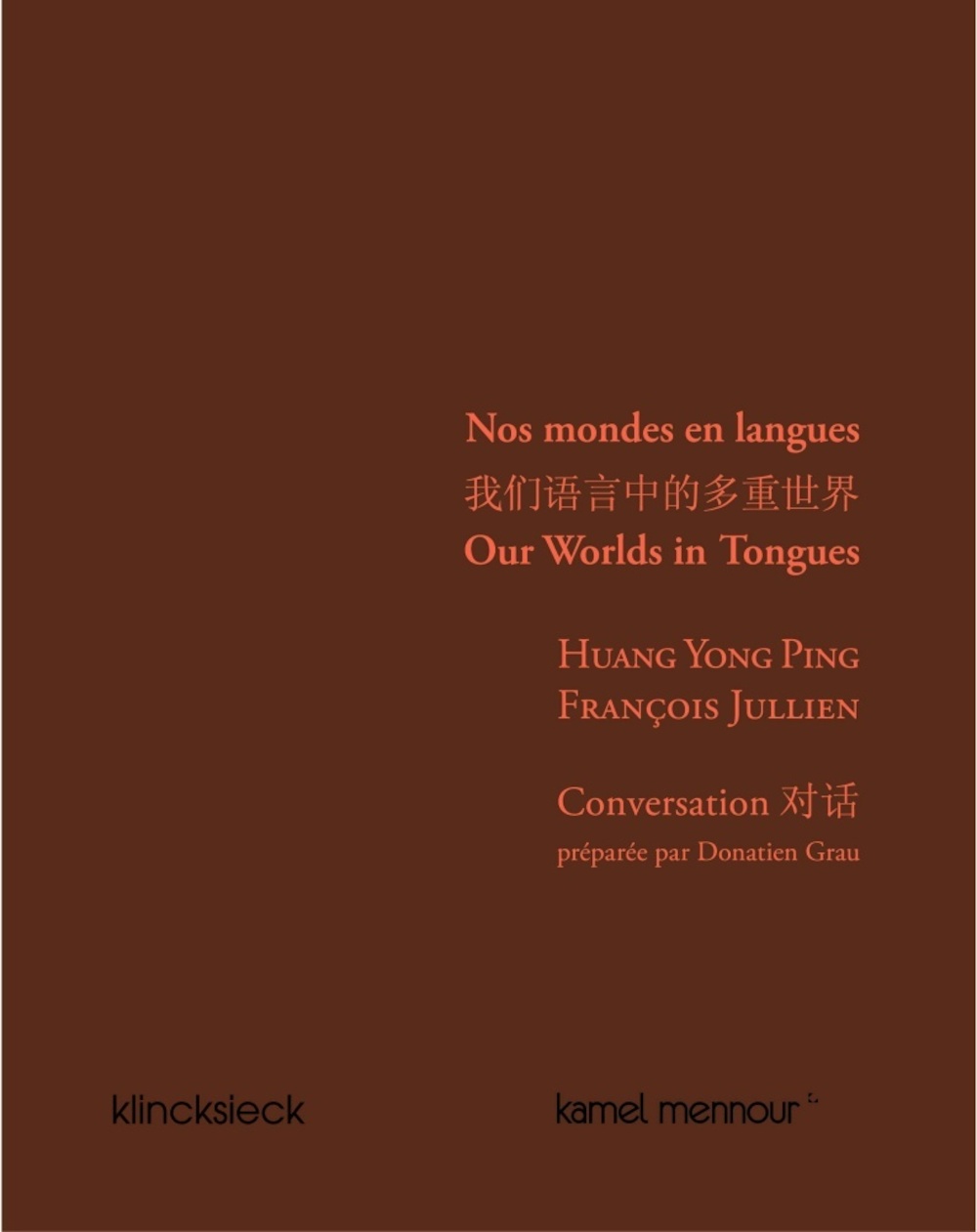 Ce livre, préparé par Donatien Grau, met en dialogue un artiste parti de Chine pour venir en France et un philosophe parti de France pour aller en Chine ; un artiste qui se préoccupe beaucoup de philosophie et  de philologie ; un philosophe qui s'est considérablement intéressé aux questions esthétiques. Existant l’un et l’autre entre la langue chinoise et la langue française, ils ont entrepris de converser sur ce qui les rapproche, et ce qui différencie leurs cheminements: ils évoquent les parcours, leurs lectures de certains textes essentiels, chinois et occidentaux, et jettent un regard précis sur le monde dans lequel ils vivent - celui de l’art, de la pensée, des civilisations. Ce livre, publié alors que le très discret Huang Yong Ping est l’invité de Monumenta, fournit une occasion unique de découvrir sa vision de l’art et du monde, de percevoir comment elle se rapproche de l’investigation philosophique de François Jullien.