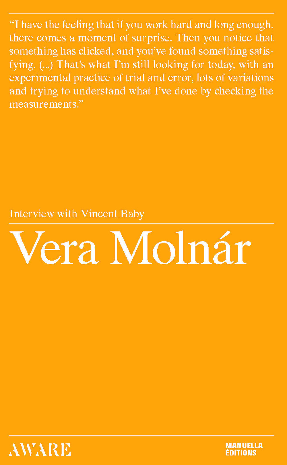 This interview with Vera Molnár was conducted and edited by Vincent Baby, art historian and curator. This third volume of interviews with artists awarded by the AWARE Outstanding Merit Prize was published after Vera Molnár received it in 2018. It is organized by the association AWARE: Archives of Women Artists, Research and Exhibitions, co-founded and directed by Camille Morineau.