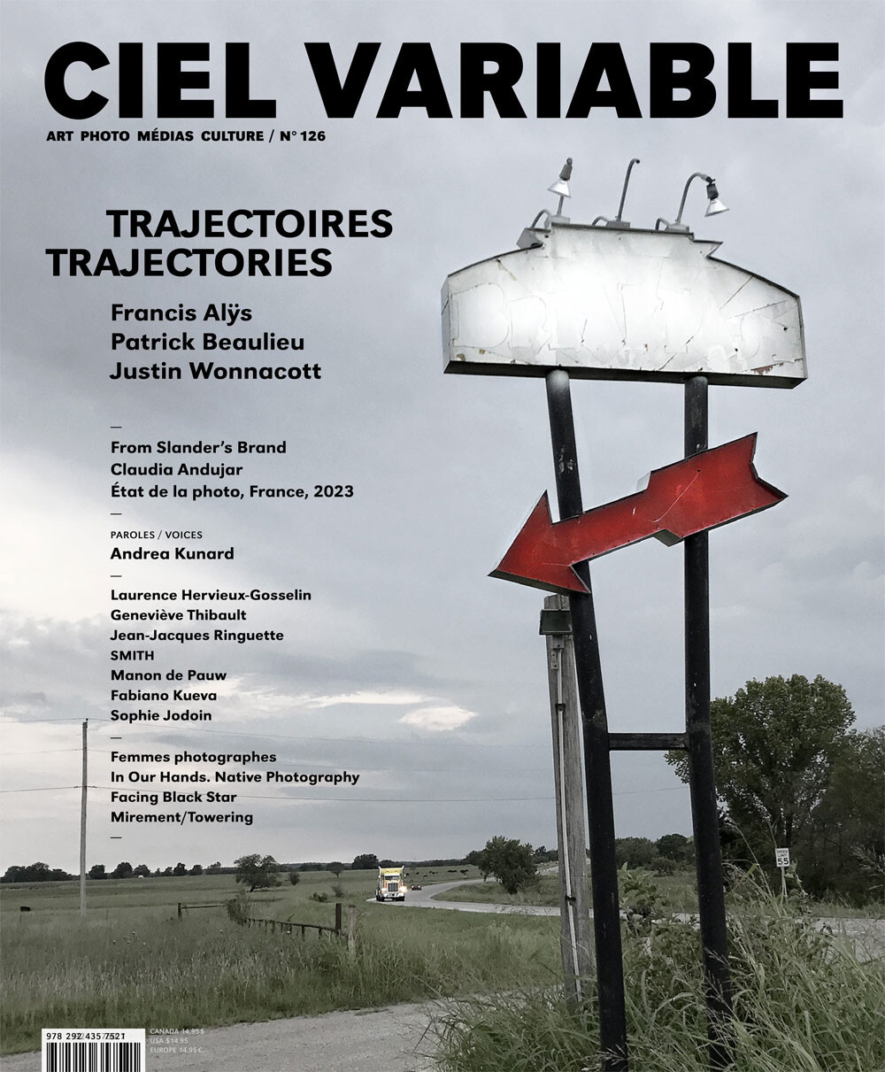 La section Actualité propose une douzaine de recensions d’expositions et de publications récentes. Expos : SMITH, Jean-Jacques Ringuette, Sophie Jodoin, Laurence Hervieux-Gosselin, Fabiano Kueva, Manon de Pauw, Geneviève Thibault. Publications : Femmes photographes, In Our Hands, Facing Black Star, Mirement/Towering.
