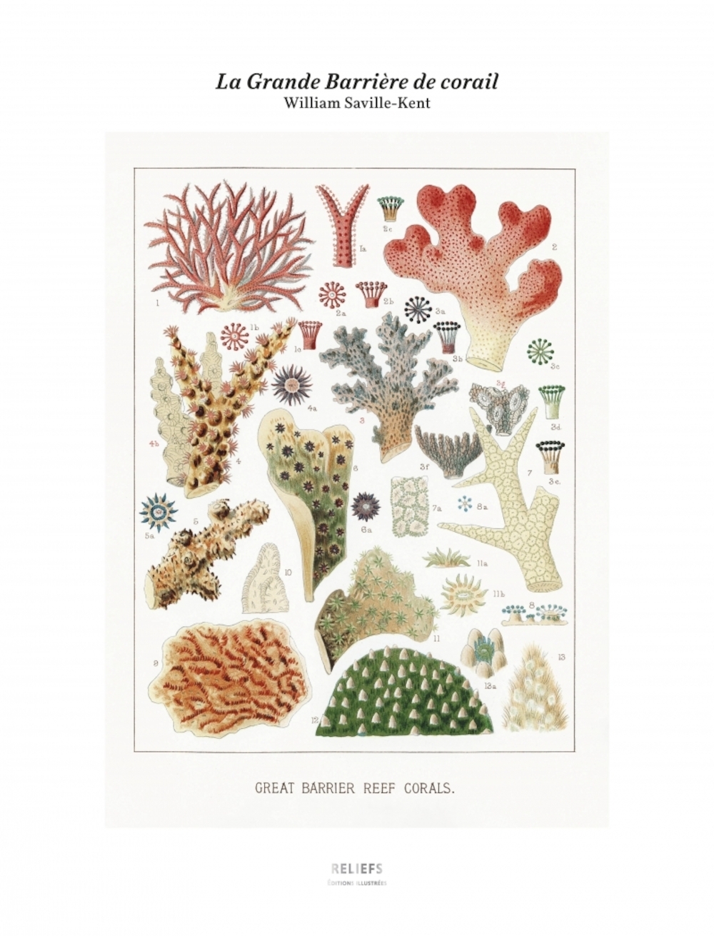 Cette planche est tirée de The Great Barrier Reef of Australia [La Grande Barrière de corail d’Australie], publié en 1893 par William Saville-Kent (1845-1908), où il décrit les coraux, polypes et autres êtres vivant dans la barrière de corail au large de la côte du Queensland. L’auteur voulait, par cet ouvrage, améliorer la connaissance du grand public et encourager le « développement des ressources merveilleuses » de cet écosystème. Le tirage reprend l’une des seize lithographies en couleurs réalisées à partir des aquarelles originales de Saville-Kent. La précision scientifique est quelque peu sacrifiée, mais l’éclat spectaculaire des couleurs rend justice aux nuances infinies de la vie proliférant alors dans la Grande Barrière de corail, menacée aujourd’hui par le réchauffement climatique.
