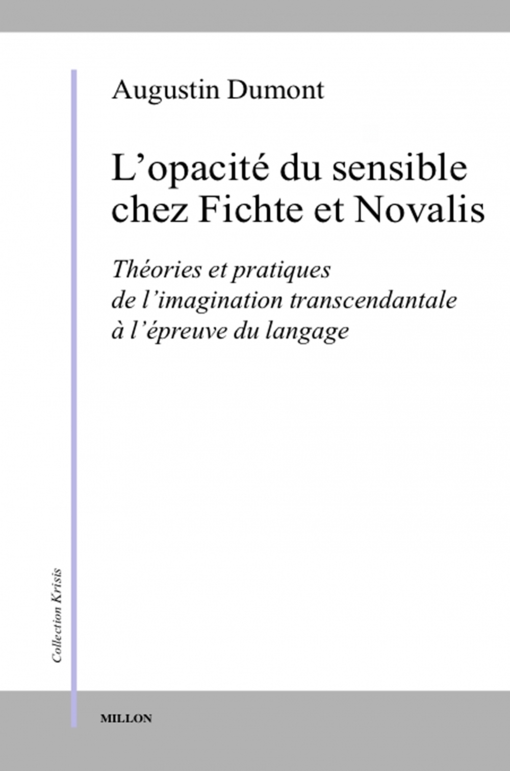 À partir d’une critique des deux réceptions – devenue canoniques – du romantisme allemand en France (Blanchot, Lacoue-Labarthe et Nancy) et en Allemagne (Frank), Augustin Dumont tente de reprendre à nouveau frais le problème romantique à l’aide d’une lecture croisée de Fichte et de Novalis, consacrée à l’articulation du langage, de l’affectivité et de l’imagination transcendantale.