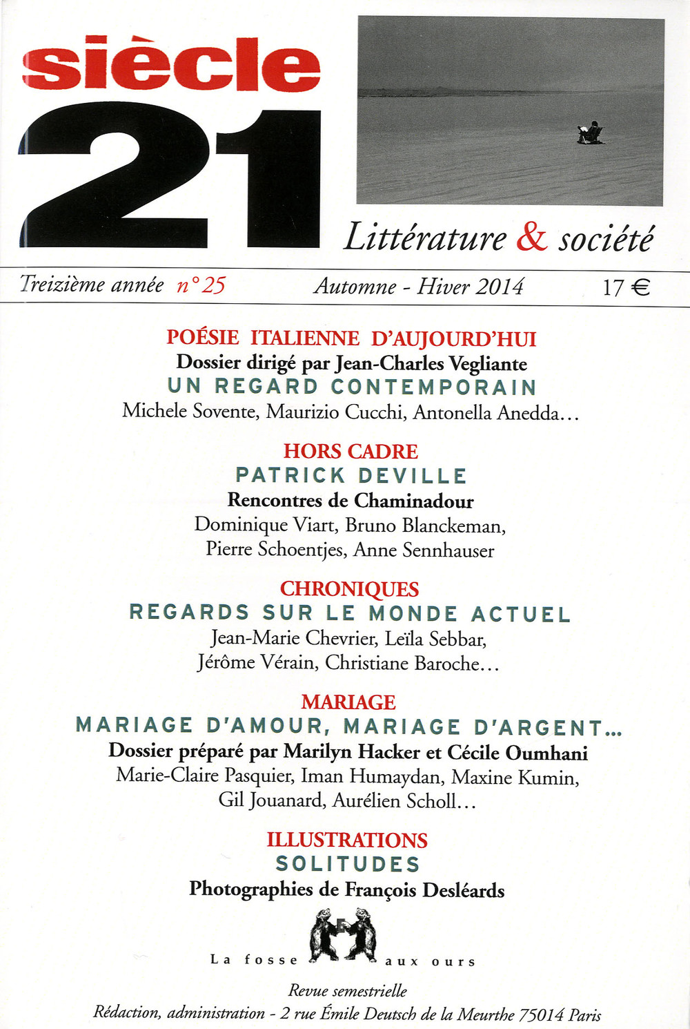 Revue semestrielle. Treizième année n° 25. Automne-Hiver 2014. Poésie italienne aujourd’hui. Dirigé par Jean-Charles Vegliante. Un regard contemporain: Michele Sovente, Mauricio Zucchi, Antonella Anedda…